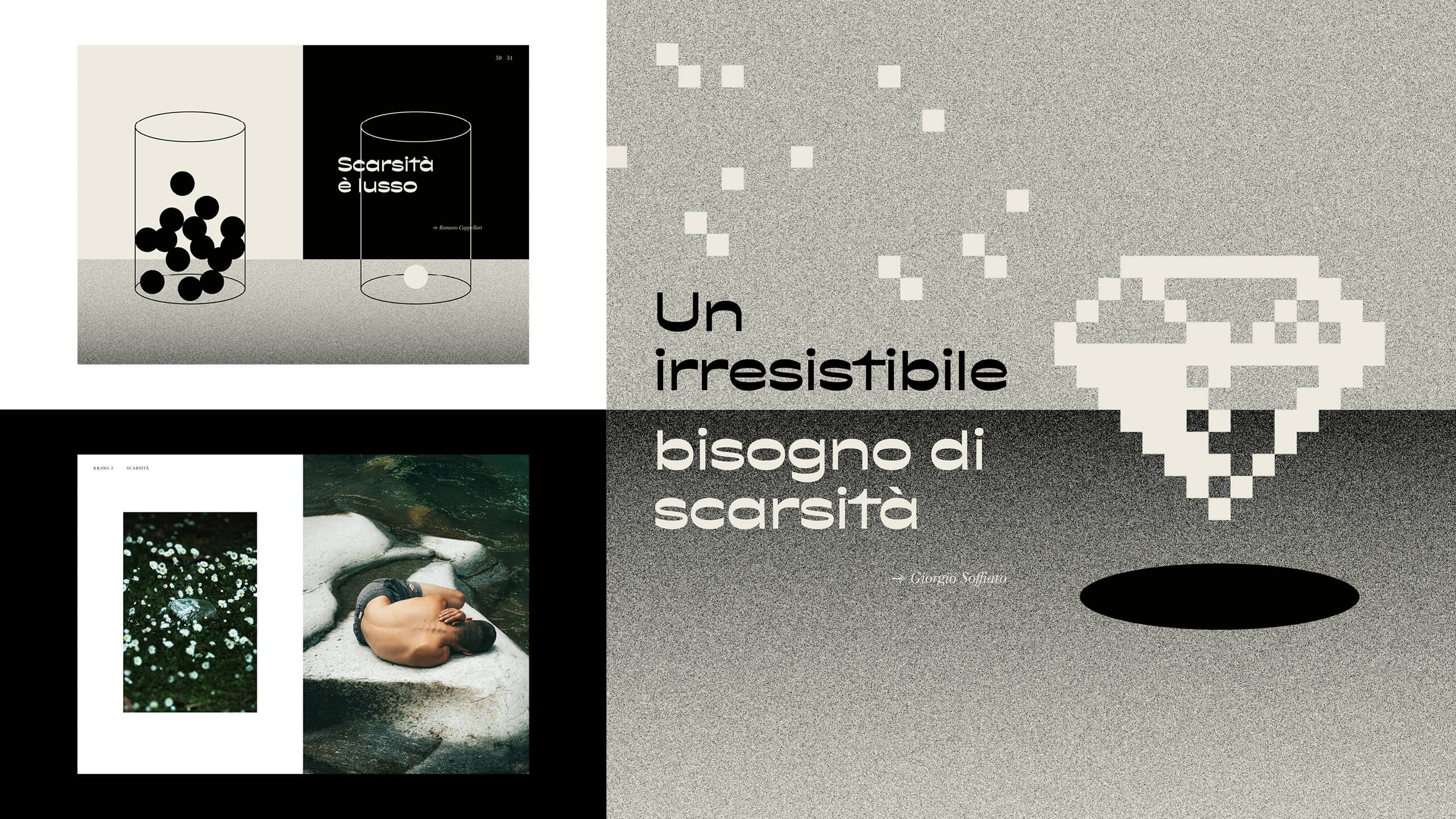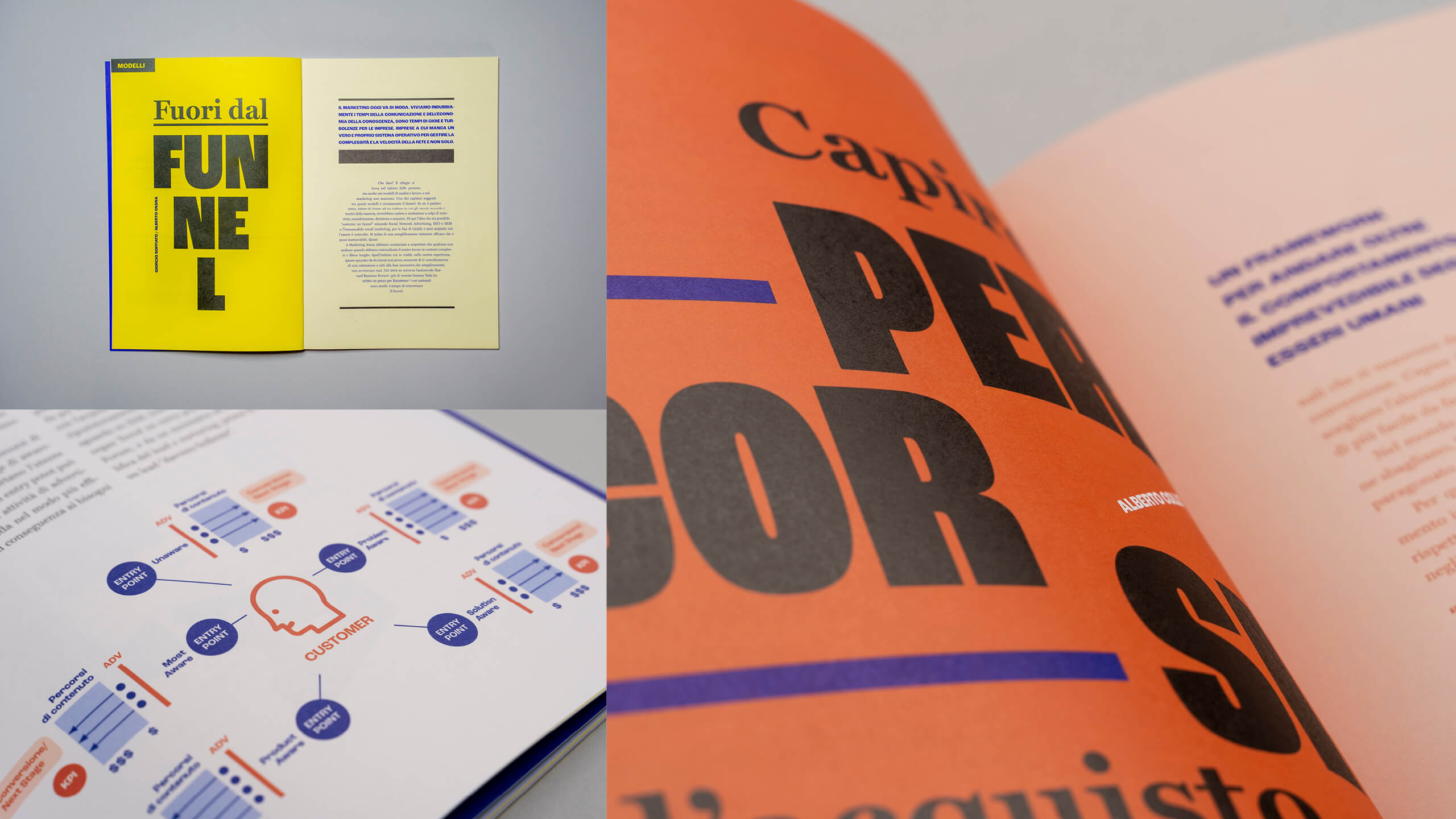Funnel, Brand, Iper, Limite, Scarsità, Ossessioni. Ogni numero è caratterizzato da un tema specifico: questo ci ha dato l’opportunità di costruire una veste grafica dedicata per ciascuna edizione, di sperimentare con la tipografia e di scegliere di volta in volta soluzioni cartotecniche che dialogassero con il tema di ciascuna monografia.
