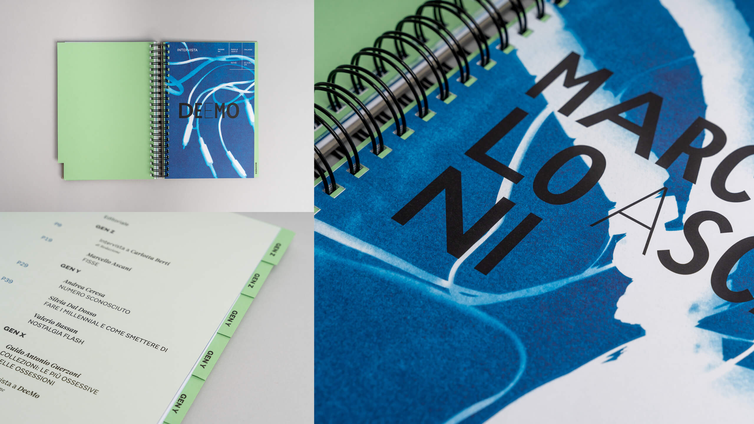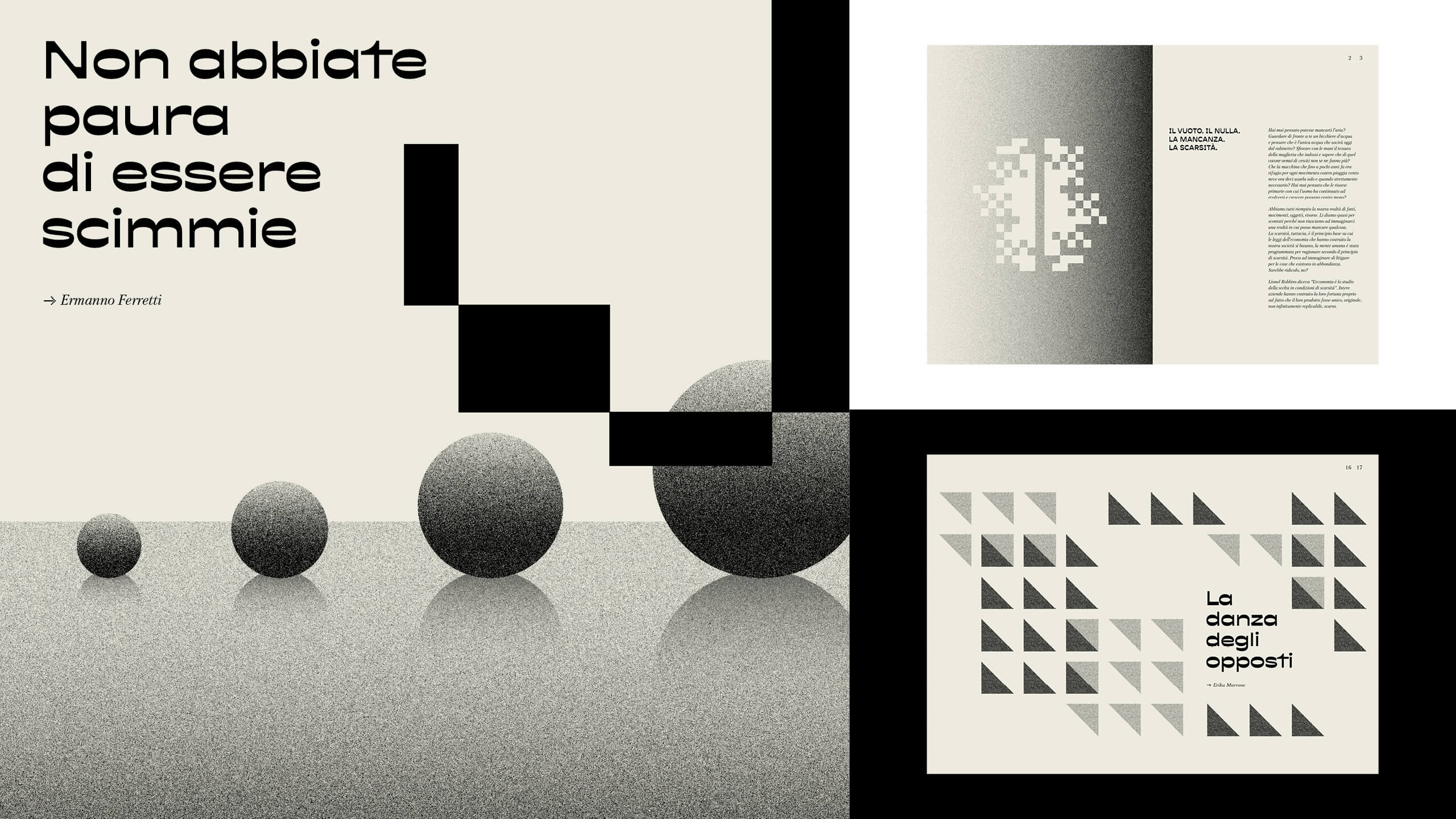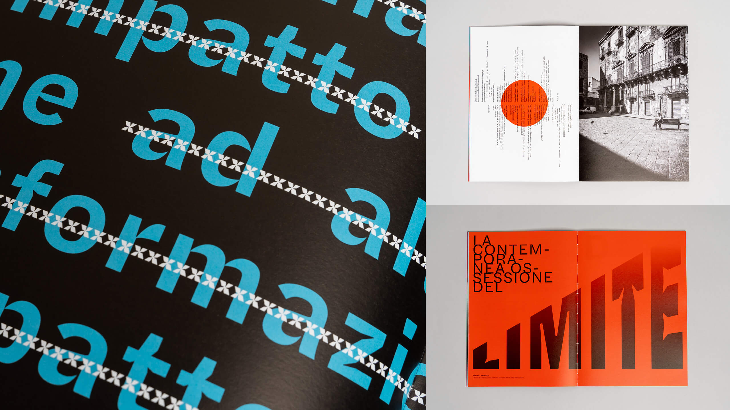 La scelta dei font e del registro iconografico, dei materiali e delle tecniche di stampa, sono stati gli strumenti attraverso i quali abbiamo cercato di tradurre visivamente i concetti chiave alla base di ogni fascicolo.